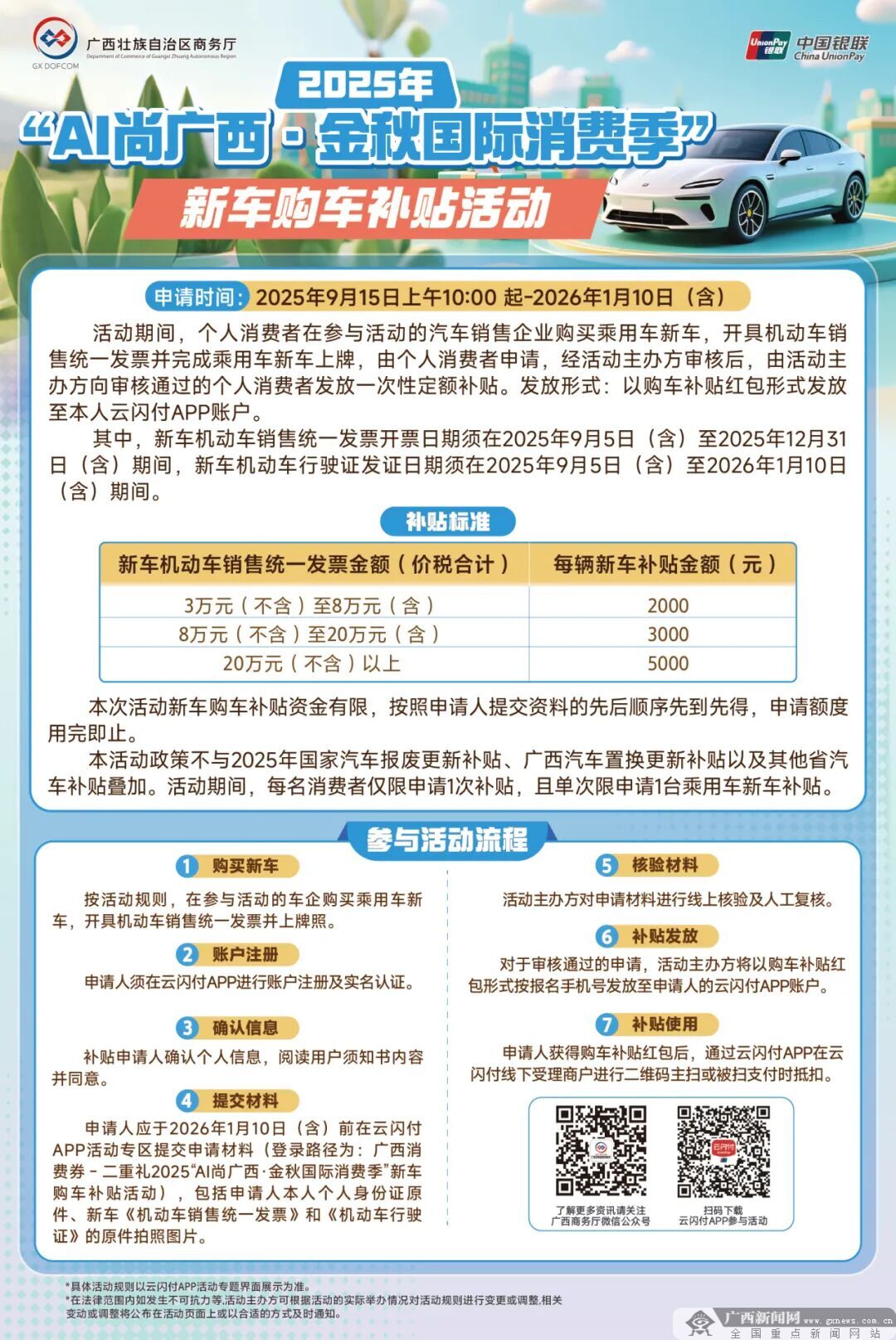 “購在中國—2025廣西惠享暖冬消費月”啟動 超億元增量資金來襲,汽車煥新最高享萬元補貼 活動期間,廣西商務廳追加1.5億元財政資金,持續(xù)開展2025“AI尚廣西·金秋國際消費季”新車購車補貼活動,個人消費者購買新能源或燃油乘用車,按購車價格可申領三檔補貼:3萬元(不含)—8萬元(含)補貼2000元,8萬元(不含)—20萬元(含)補貼3000元,20萬元(不含)以上補貼5000元。目前,活動火熱進行中,消費者可前往云閃付活動平臺專區(qū)申領,補貼資金有限,先領先得。