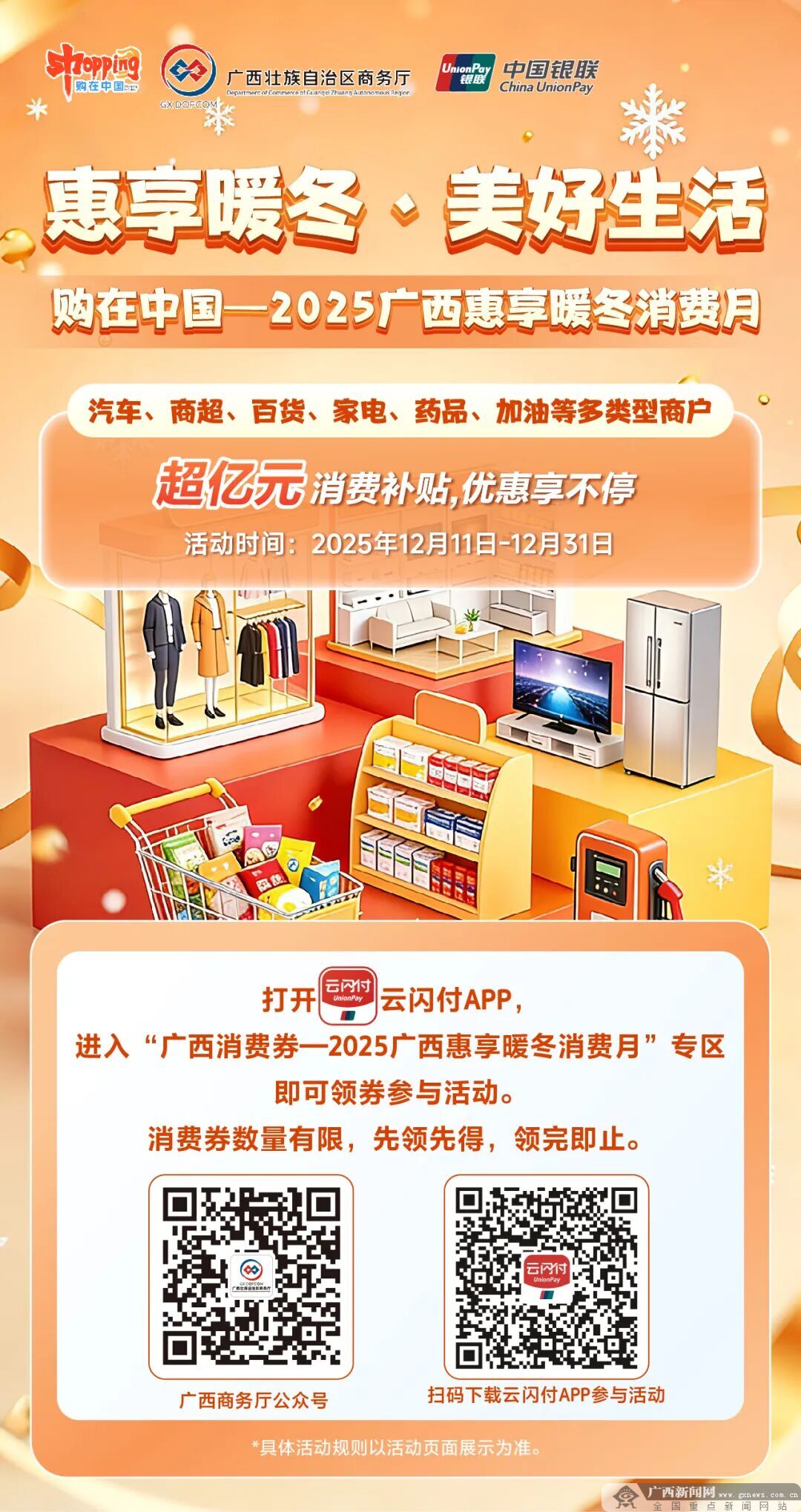 12月11日,廣西商務廳聯(lián)動全區(qū)14個地市、111個縣(市、區(qū))超萬家商戶,在全區(qū)范圍內重磅啟動“購在中國—2025廣西惠享暖冬消費月”系列活動,活動將持續(xù)到年底,從汽車煥新到日用百貨,從廣西好物到東盟優(yōu)品,從美食聚餐到暖心住宿,政府補貼+企業(yè)讓利+金融助力多重優(yōu)惠疊加,共同打造一場“吃穿住行游購娛”全場景的消費盛宴。