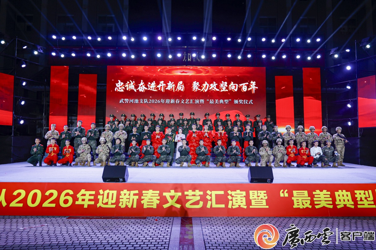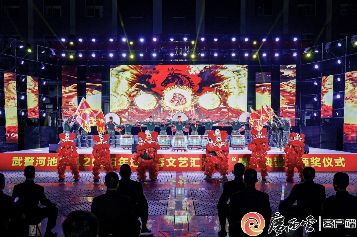 開場舞《鼓震雄獅迎春暉》。 近日,武警廣西總隊(duì)河池支隊(duì)舉行2026年迎新春文藝匯演暨“最美典型”頒獎(jiǎng)儀式,支隊(duì)官兵及家屬歡聚一堂,共享榮耀時(shí)刻,現(xiàn)場暖意融融、喜氣洋洋,處處洋溢著團(tuán)圓奮進(jìn)的新春氣息。 此次活動(dòng)以“忠誠奮進(jìn)開新局 聚力攻堅(jiān)向百年”為主題,分“忠誠”“勝戰(zhàn)”“奮進(jìn)”三個(gè)篇章,采用兵說兵、兵演兵、兵唱兵的形式,融合視頻短片、合唱演奏、動(dòng)感舞蹈等多種表現(xiàn)形式,全方位展現(xiàn)支隊(duì)官兵看齊追隨、思責(zé)研戰(zhàn)的精神風(fēng)貌。 武術(shù)表演《男兒當(dāng)自強(qiáng)》。 晚會(huì)伊始,一部反映支隊(duì)工作風(fēng)貌的專題片拉開序幕,緊接著,氣勢恢宏的開場舞《鼓震雄師迎春暉》震撼全場,迅速點(diǎn)燃了現(xiàn)場喜慶振奮的氛圍。《信仰之光》《少年說》《男兒當(dāng)自強(qiáng)》等節(jié)目輪番上演,詮釋官兵對(duì)黨忠誠的底色、“強(qiáng)軍有我”的堅(jiān)定誓言和“練為戰(zhàn)、戰(zhàn)必勝”的戰(zhàn)斗精神。男女對(duì)唱《左手牽你右手敬禮》與情景舞蹈深度融合、以敘抒情,再現(xiàn)官兵在使命與家庭間的深情抉擇,感人至深。紅水河樂隊(duì)獻(xiàn)唱的歌曲串燒引發(fā)全場大合唱,歌聲中飽含戰(zhàn)友情誼與追夢熱忱。河池市公安局原創(chuàng)脫口秀《不要你覺得 我要我覺得》風(fēng)趣幽默,生動(dòng)展現(xiàn)了軍警民攜手、共筑平安的深厚情誼。演出在合唱《強(qiáng)軍戰(zhàn)歌》中圓滿落幕,一個(gè)個(gè)精彩節(jié)目接續(xù)上演,現(xiàn)場掌聲、吶喊聲此起彼伏,充盈著喜慶、感動(dòng)與滿滿正能量。 演出期間,穿插舉行“最美典型”頒獎(jiǎng)環(huán)節(jié),現(xiàn)場為最美軍人、最美軍嫂、十佳班長等先進(jìn)典型頒發(fā)證書和獎(jiǎng)杯,勉勵(lì)全體官兵爭當(dāng)先進(jìn)、接續(xù)奮斗、再立新功,同時(shí)向默默堅(jiān)守、無私付出的軍嫂們致以誠摯感謝。 演職人員合影留念。 戰(zhàn)歌鏗鏘賀新歲,奮斗強(qiáng)軍展新顏。整場晚會(huì)主題鮮明、內(nèi)容豐富,為官兵及家屬呈現(xiàn)了一場精彩紛呈的視聽盛宴。官兵們紛紛表示,新的一年將牢記職責(zé)使命,以躍馬揚(yáng)鞭的勇氣、萬馬奔騰的活力、馬不停蹄的干勁,奮力譜寫支隊(duì)全面建設(shè)高質(zhì)量發(fā)展的嶄新篇章。 |