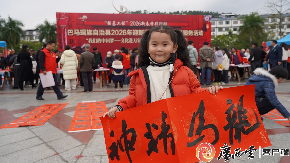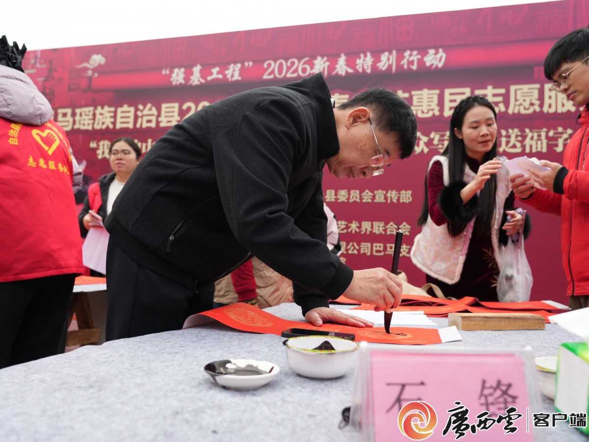 圖為書法家們現(xiàn)場提筆揮毫。韋求蓉 攝 2月7日,巴馬瑤族自治縣在壽鄉(xiāng)文化廣場舉行2026年迎新春文藝惠民志愿服務(wù)活動(dòng),多位中國書法家協(xié)會會員現(xiàn)場免費(fèi)寫春聯(lián)、送福字,將滿載著美好寓意的春聯(lián)和祝福送到千家萬戶。 活動(dòng)中,書法家們一字排開,寫下一副副寓意吉祥的春聯(lián)和端莊大氣的“!弊帧!盎丶亦l(xiāng)給父老鄉(xiāng)親們寫春聯(lián),非常高興,;丶铱纯催@是我們的心愿,雖然我們走出巴馬多年但是我們是巴馬培養(yǎng)的書法家,為家鄉(xiāng)父老鄉(xiāng)親服務(wù)是我們應(yīng)盡的義務(wù),我們的鄉(xiāng)親們也很熱情,給我們很多鼓勵(lì)!敝袊鴷覅f(xié)會會員、廣西書畫院原院長石鋒在現(xiàn)場動(dòng)情地說。 活動(dòng)現(xiàn)場。張宇微 攝 此次活動(dòng)不僅吸引了眾多書法愛好者前來觀摩學(xué)習(xí),更得到了廣大市民的熱烈歡迎。幼兒園的小朋友李錦妤一大早便和母親來到廣場排隊(duì)等候!敖裉煳液蛬寢屢黄饋韽V場請老師寫春聯(lián),老師給我寫了‘龍馬精神’!彼弥E未干的春聯(lián),臉上洋溢著甜甜的笑容。 圖為群眾到現(xiàn)場領(lǐng)取春聯(lián)。韋求蓉 攝 市民陸全寶通過短視頻平臺得知活動(dòng)消息!拔覀兛炊桃曨l知道老師們要來免費(fèi)寫春聯(lián)、送祝福,所以今天我們?nèi)叶歼^來,也希望新的一年福氣滿滿、福運(yùn)到家!彼踔鴦偰玫降摹案!弊,喜悅之情溢于言表。 據(jù)悉,此次活動(dòng)是由巴馬瑤族自治縣委員會宣傳部、廣西墨寶緣書畫院及巴馬瑤族自治縣文學(xué)藝術(shù)界聯(lián)合會聯(lián)合舉辦。本次“我們的中國夢——文化進(jìn)萬家”活動(dòng)是巴馬春節(jié)期間系列文化惠民活動(dòng)的重要組成部分,旨在以筆墨為載體,以春聯(lián)為紐帶,進(jìn)一步擦亮巴馬“書法之鄉(xiāng)”文化名片,讓廣大群眾在翰墨飄香中感受中華傳統(tǒng)文化的魅力,共同度過一個(gè)喜慶、文明、祥和的中國年。