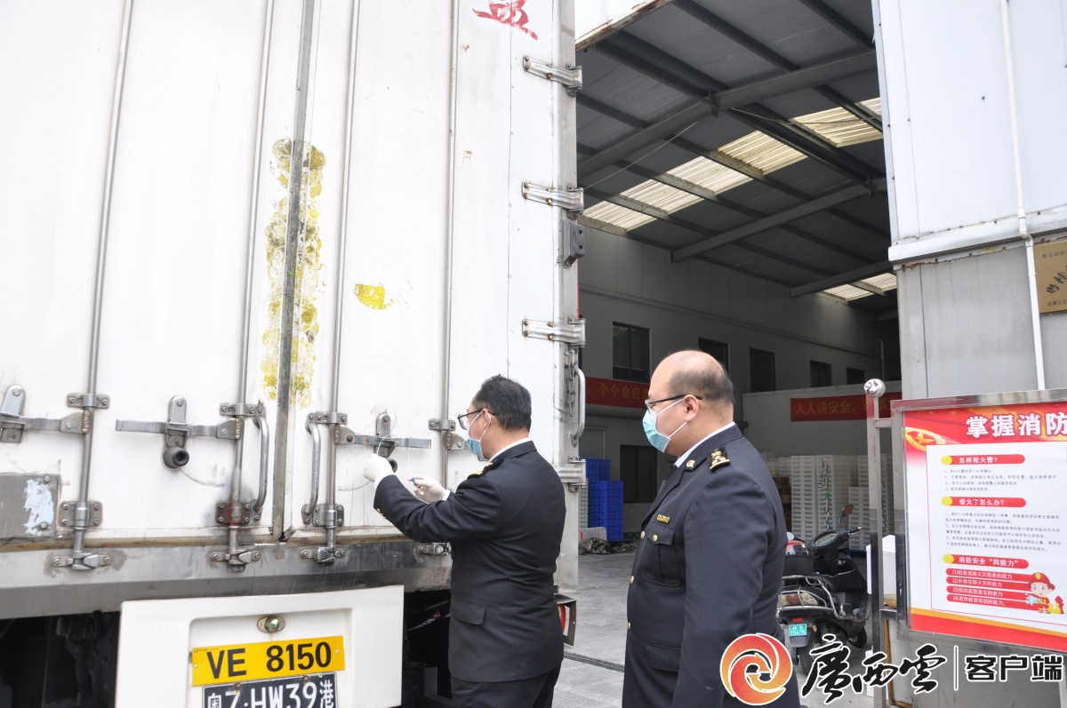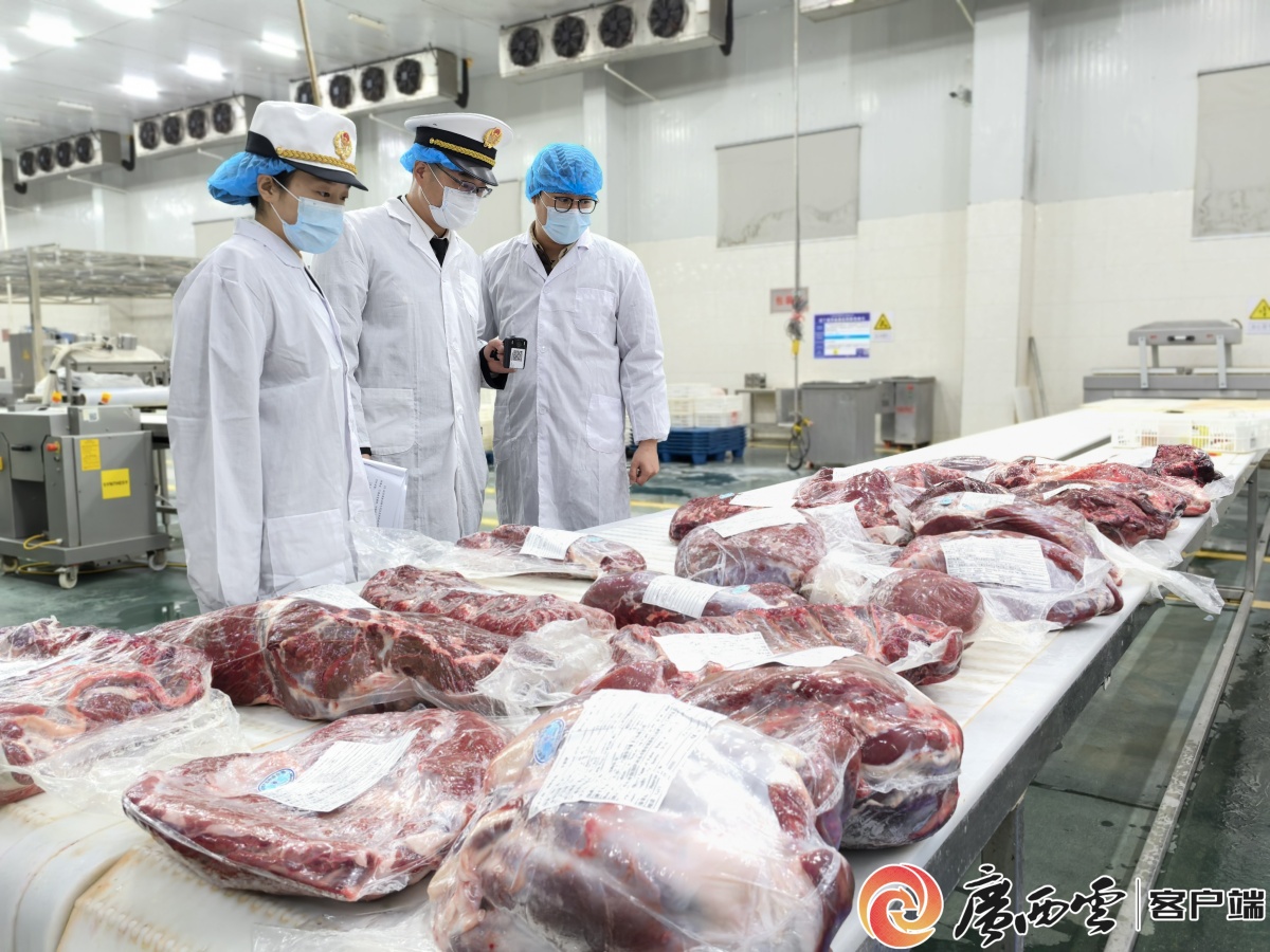 河池海關關員對供港冰鮮牛肉進行屬地查檢。 2月9日,記者從河池海關獲悉,去年河池市外貿(mào)發(fā)展動能澎湃,進出口總值突破87億元人民幣,同比大幅增長50%,增速位居全區(qū)第二。其中,出口17.6億元,同比增長82%,增速位居全區(qū)第一;進口69.5億元,同比增長43.9%,增速位居全區(qū)第二。