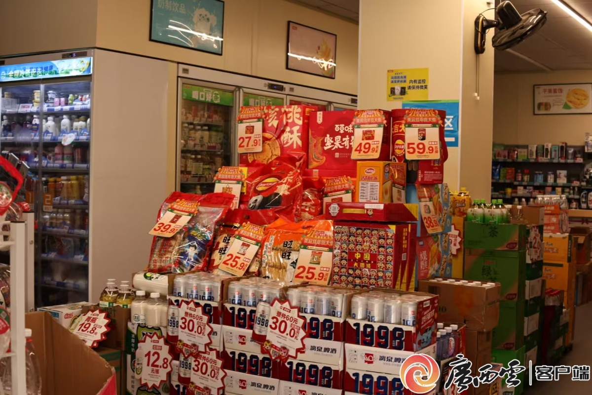 擺在超市最顯眼位置的新年零食禮包。 新春臨近,環(huán)江毛南族自治縣處處洋溢著濃厚的春節(jié)氛圍。環(huán)江城區(qū)從農(nóng)貿(mào)市場到街邊小店,各式年貨悄然上架,鋪開了一幅鮮活的迎春圖景。 農(nóng)貿(mào)市場是年味最濃的地方。各類年貨早早擺滿攤位,琳瑯滿目。成堆的新年零食禮盒勾起大家熟悉的記憶,高掛的大紅福字隨風(fēng)輕動,預(yù)告著春節(jié)的來臨。臘肉油亮飽滿,散發(fā)著誘人的咸香,是許多家庭年夜飯中不可缺少的美味。