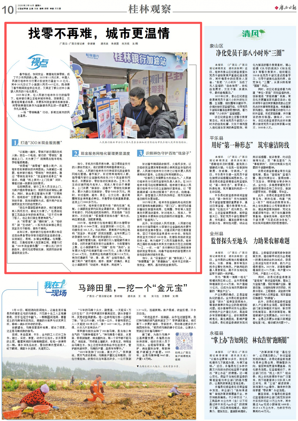 桂林銀行工作人員向出租車(chē)司機(jī)提供“零錢(qián)包”兌換服務(wù)。 現(xiàn)金服務(wù)網(wǎng)格化管理更顯溫度 如今,手機(jī)支付雖然很方便,但習(xí)慣現(xiàn)金支付的人群依然龐大,他們的需求同樣值得被關(guān)注。 為此,人民銀行桂林市分行持續(xù)深化現(xiàn)金服務(wù)網(wǎng)格化管理。春節(jié)前夕,針對(duì)特殊地域與人群,指導(dǎo)轄內(nèi)銀行業(yè)金融機(jī)構(gòu)依托252個(gè)現(xiàn)金服務(wù)網(wǎng)格點(diǎn),開(kāi)展新鈔、零鈔流動(dòng)兌換活動(dòng)。工作人員主動(dòng)對(duì)接網(wǎng)格內(nèi)老年人、殘疾人等行動(dòng)不便群體,上門(mén)開(kāi)展“換新鈔、迎春節(jié)”零錢(qián)包兌換服務(wù),累計(jì)為群眾兌換新鈔、零鈔5000多萬(wàn)元。同時(shí),針對(duì)醫(yī)院、超市、景區(qū)、公交公司、重點(diǎn)商圈等現(xiàn)金使用重點(diǎn)單位,開(kāi)通零鈔兌換直通渠道,送現(xiàn)上門(mén)2000多萬(wàn)元。 2025年,桂林銀行探索升級(jí)“預(yù)約兌換”機(jī)制:小面額現(xiàn)金預(yù)約實(shí)現(xiàn)全渠道開(kāi)放,客戶可通過(guò)手機(jī)銀行、網(wǎng)點(diǎn)電話或現(xiàn)場(chǎng)預(yù)約,靈活選擇“當(dāng)日預(yù)約、次日兌換”“緊急需求現(xiàn)場(chǎng)辦理”等方式,響應(yīng)更迅速,流程更便捷。 2025年,桂林銀行在桂林轄區(qū)累計(jì)辦理零鈔兌換業(yè)務(wù)10.0484萬(wàn)筆,總金額突破1.22億元,日均服務(wù)近300人次。與此同時(shí),聚焦商戶與同業(yè)機(jī)構(gòu)“現(xiàn)金多、轉(zhuǎn)運(yùn)難”的現(xiàn)實(shí)難題,全年開(kāi)展上門(mén)收款服務(wù)589次,累計(jì)收款金額達(dá)2.49億元。 在硬幣管理方面,桂林銀行引入智能硬幣清分設(shè)備,對(duì)歷史硬幣庫(kù)存進(jìn)行全面清分、分類(lèi)管理與上繳,讓小面額硬幣從“沉睡”走向“流動(dòng)”。全年累計(jì)為客戶兌換硬幣超1000萬(wàn)元,上繳人民銀行641.4萬(wàn)元,支援同業(yè)機(jī)構(gòu)硬幣兌換312.8萬(wàn)元,有效打通硬幣“收、清、調(diào)、用”全鏈條堵點(diǎn),緩解了商戶“硬幣難找、難存、難換”的痛點(diǎn),真正讓小面額貨幣“動(dòng)起來(lái)、轉(zhuǎn)起來(lái)、用起來(lái)”。 識(shí)假辨?zhèn)问刈o(hù)百姓“錢(qián)袋子” 針對(duì)春節(jié)期間誤收假幣、火燒幣多發(fā),以及拒收現(xiàn)金偶發(fā)等影響群眾使用現(xiàn)金體驗(yàn)的問(wèn)題,人民銀行桂林市分行持之以恒開(kāi)展人民幣使用知識(shí)宣傳,讓百姓過(guò)年用錢(qián)更安心。 “反假幣工作需要各方形成合力!比嗣胥y行桂林市分行貨幣金銀科負(fù)責(zé)人表示。在2025桂林半程馬拉松賽事期間,桂林銀行聯(lián)合人民銀行桂林市分行設(shè)立金融知識(shí)宣傳站,以“零距離講解+實(shí)物對(duì)照演示”的方式,向跑者、商戶、游客普及人民幣防偽特征、殘幣兌換標(biāo)準(zhǔn)及假幣處置流程。 2025年以來(lái),桂林市各金融機(jī)構(gòu)也將反假貨幣宣傳陣地搬到群眾“家門(mén)口”:銀行網(wǎng)點(diǎn)循環(huán)播放反假宣傳視頻,在商圈、學(xué)校等人流密集處開(kāi)展流動(dòng)宣傳,針對(duì)老年人、殘疾人、學(xué)生等群體開(kāi)展有針對(duì)性的假幣識(shí)別宣教,嚴(yán)防假幣“趁虛而入”。 此外,針對(duì)拒收人民幣現(xiàn)象,人民銀行桂林市分行指導(dǎo)轄內(nèi)32家銀行業(yè)金融機(jī)構(gòu)開(kāi)展節(jié)前拒收現(xiàn)金集中整治,對(duì)重點(diǎn)商戶進(jìn)行摸排宣傳,簽訂不拒收現(xiàn)金承諾書(shū)180余份,張貼支持現(xiàn)金支付標(biāo)識(shí)200余張,處理各類(lèi)拒收現(xiàn)金投訴4起,有力維護(hù)了人民幣流通秩序。桂林兩江國(guó)際機(jī)場(chǎng)境外來(lái)賓支付服務(wù)示范區(qū)及陽(yáng)朔“一江、一河、一街”支付便利示范區(qū)持續(xù)保持拒收現(xiàn)金零投訴,向春節(jié)赴桂林的游客展示開(kāi)放包容的良好城市形象。 如今,從“設(shè)備到點(diǎn)”到“服務(wù)到人”,從“物理覆蓋”到“渠道融合”,桂林市正織就一張安全、便民、高效的現(xiàn)金服務(wù)網(wǎng)。