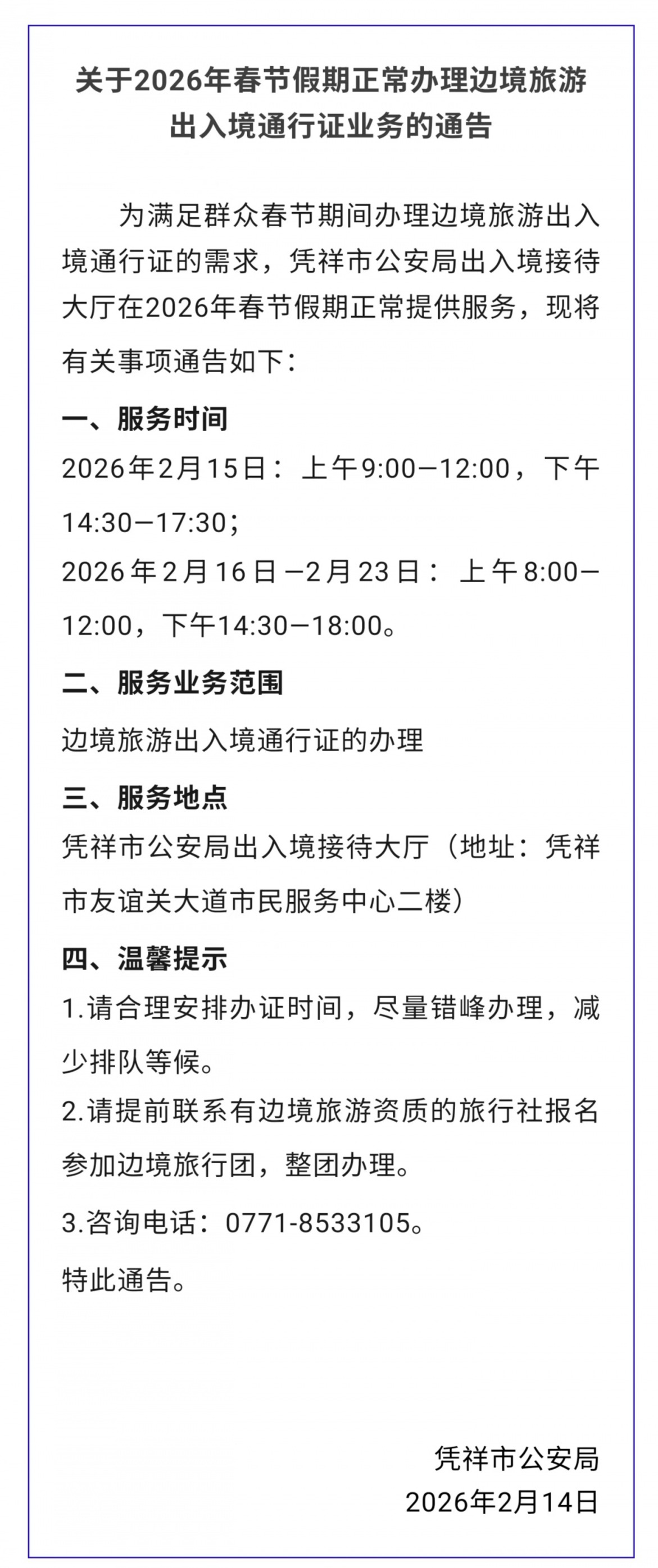2月14日,憑祥市公安局發(fā)布公告稱,為滿足群眾春節(jié)期間辦理邊境旅游出入境通行證的需求,憑祥市公安局出入境接待大廳在2026年春節(jié)假期正常提供服務(wù)。 具體通告如下: