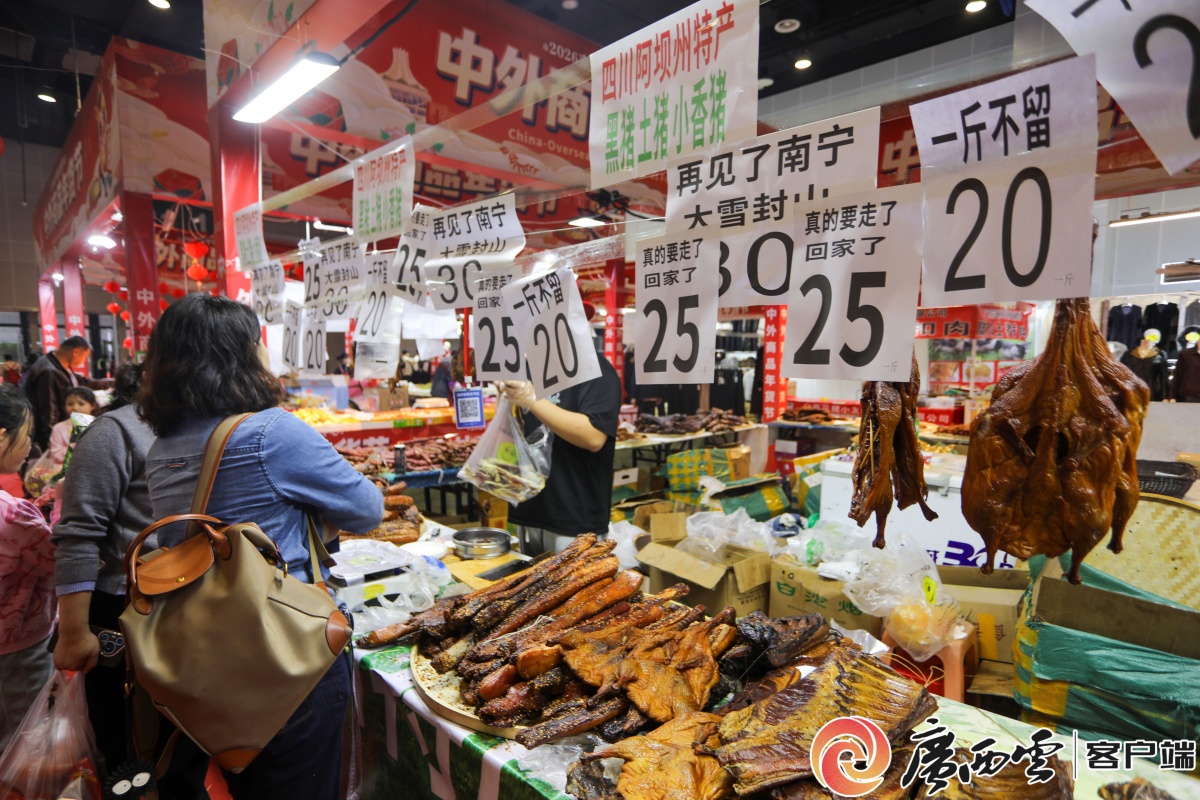 2月13日,2026 南寧國際會展中心中外商品年貨節(jié)迎來最后一天,F(xiàn)場年味濃郁、人氣火爆,各類年貨迎來清倉特惠,價格格外實惠。市民們紛紛抓住最后的機會前來采購,臘肉、臘腸、臘鴨香氣撲鼻,海魚干、各式糖餅琳瑯滿目,讓人目不暇接。大家精心挑選、滿載而歸,處處都是熱鬧喜慶的氛圍。這場年貨盛會不僅方便了市民置辦年貨,更讓大家在濃濃的煙火氣里,提前感受到了團圓幸福的年味兒。