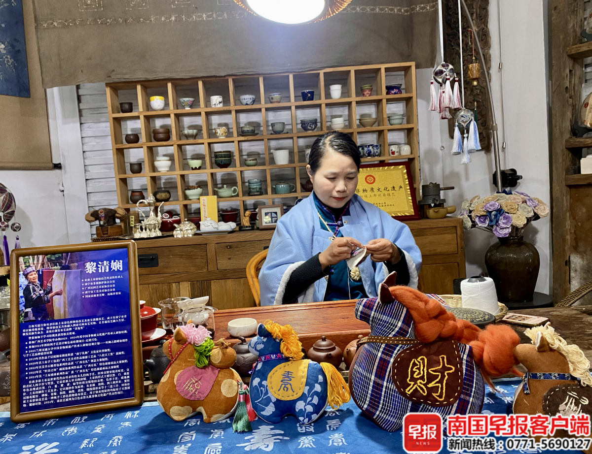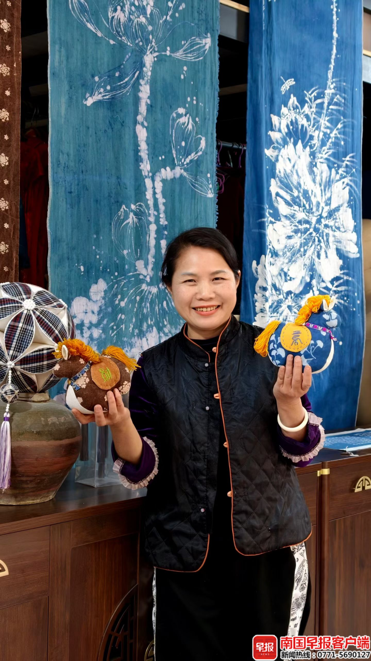 黎清嫻2月受邀到馬山做非遺公益展示。受訪者供圖 黎清嫻告訴記者,每年春節(jié)來臨之際,她還會留意和當年的屬相結(jié)合創(chuàng)作。例如今年馬年,從2025年底她就開始尋找創(chuàng)意靈感,后來無意中在一部介紹唐馬的紀錄片中,留意到唐馬形象渾圓豐滿,不僅有種天然萌感,更有一種盛世情懷。于是她以唐馬為原型設(shè)計,用百色傳統(tǒng)土布加上天然薯莨染布拼接手縫,用彩色毛線做馬鬃毛,制作出肥嘟嘟的布馬,再在馬背上手繡出“福祿壽喜財”字樣,就更有吉祥寓意了。