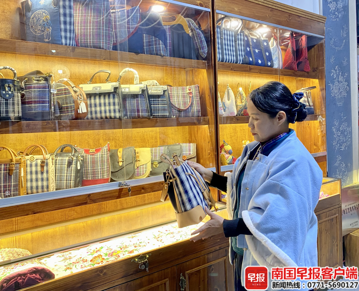 黎清嫻還原創(chuàng)設(shè)計了很多土布包包。 前幾年參加廣西有禮文創(chuàng)大賽時,黎清嫻還想到了將苗族的蠟染非遺技藝與耗時長的壯繡相結(jié)合。用蠟染取代壯繡,但保留壯族手繪的牡丹圖案,創(chuàng)作出一副蠟染壯染融合作品,再以衣襟形式融入土布長裙長衣中,既有民族特色,又有非遺創(chuàng)新表達,在當年的文創(chuàng)大賽中讓人眼前一亮。