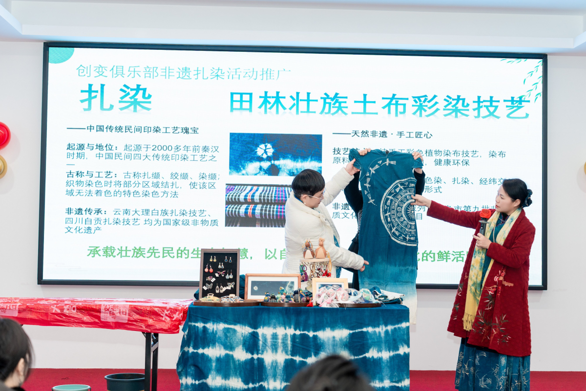 黎清嫻受邀給企業(yè)家講解、展示非遺壯族土布彩染技藝。受訪者供圖 進入2026年的一個多月里,黎清嫻已經(jīng)持續(xù)參與了多場不同主題的非遺活動,例如1月初,受邀參加2026“李寧杯”中國東盟匹克球公開賽的匹克市集;接著又跟著南寧市社會組織公益創(chuàng)投項目走進各地社區(qū),如南寧鳳嶺北社區(qū)、馬山縣合福社區(qū)等。1月底,又受一個企業(yè)家俱樂部邀請到迎新茶話年會給上百名本地企業(yè)家講述非遺彩染的傳承融合。聽完講解,企業(yè)家們還動手嘗試了非遺彩染,受益匪淺。