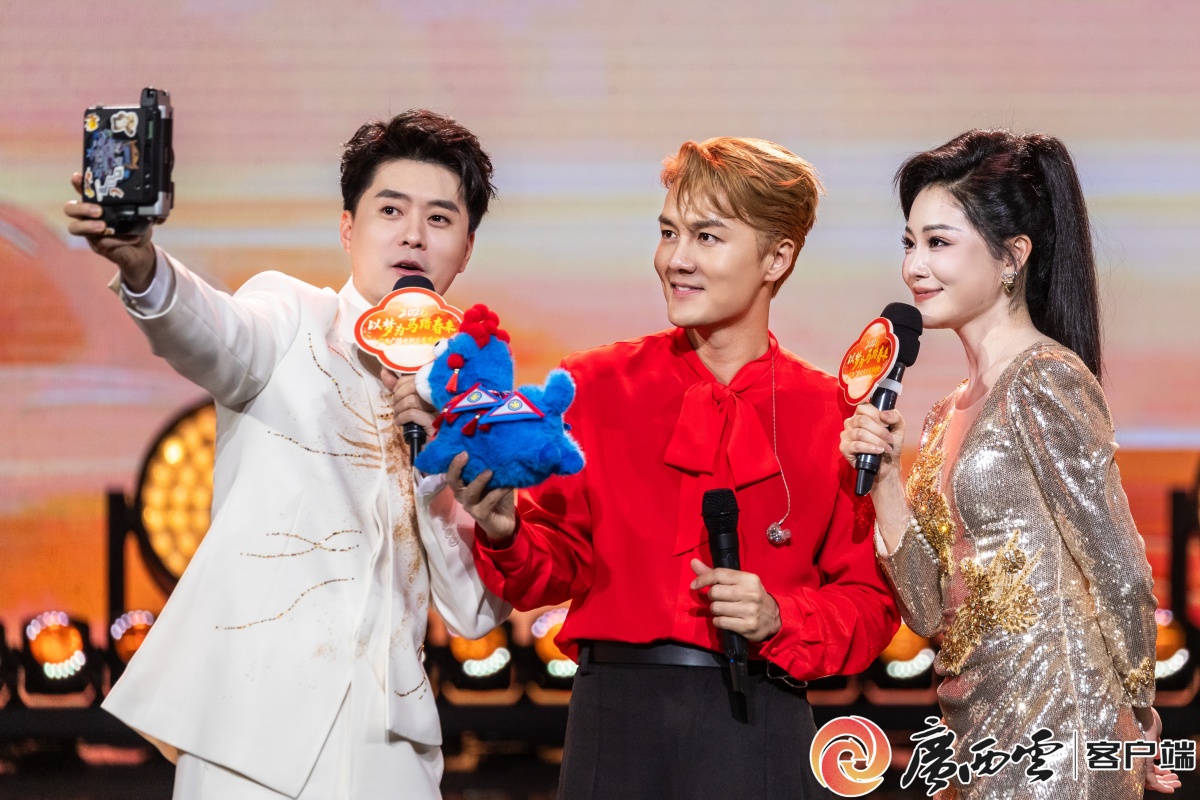 茅盾文學獎得主東西(左二)、兒童文學作家王勇英(右二)分享故鄉(xiāng)情懷。 此外,晚會唱響民族團結(jié)歡歌,MIYA 組合攜手扎西頓珠、舒克、阿音坊組合共唱《同心歡歌》;情景服飾秀《自古就很 “潮”》展現(xiàn)傳統(tǒng)服飾之美與文化自信。立足面向東盟區(qū)位優(yōu)勢,晚會融入絲路元素,中泰合拍短劇歌曲秀、東南亞風情表演《你好》等節(jié)目,傳遞中國 — 東盟友好情誼。 晚會還結(jié)合電視劇《陣地》打造節(jié)目《愛國三問》,激發(fā)家國情懷;創(chuàng)意喜劇、跨國歌曲秀盡顯平臺創(chuàng)作活力,F(xiàn)場發(fā)布以徳保矮馬為原型、融合桂劇元素的馬年吉祥物 “哎喲馬” 文創(chuàng)產(chǎn)品,備受明星與觀眾喜愛。