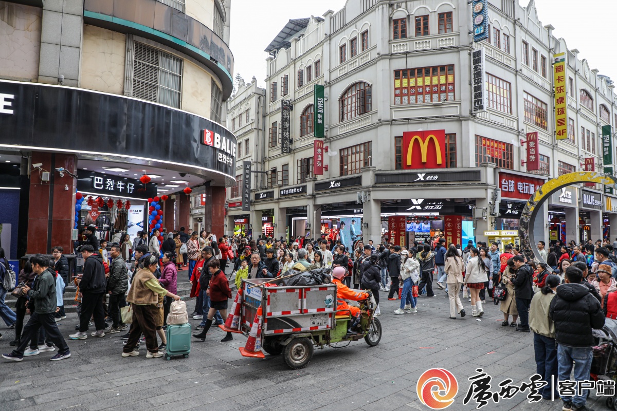 南寧步行街游人如織,環(huán)衛(wèi)工人堅守崗位清掃路面,守護(hù)城市潔凈 盧伊琳 攝