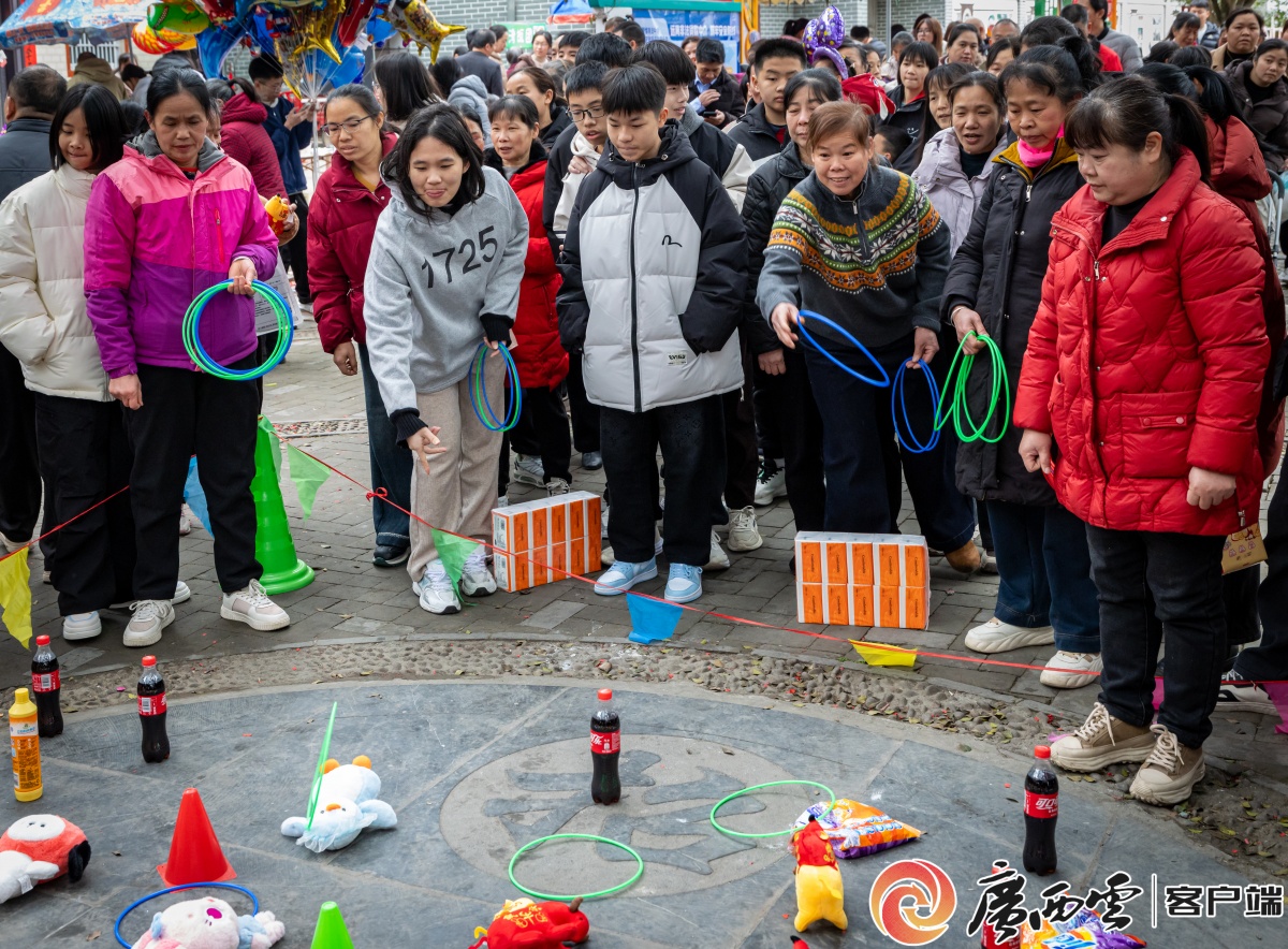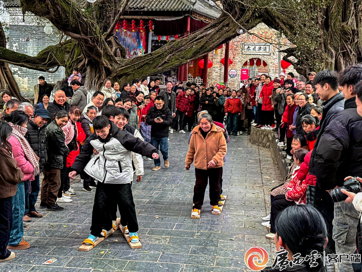 2月17日,正月初一,桂林市平樂縣榕津鎮(zhèn)千年古榕群廣場(chǎng)張燈結(jié)彩、喜氣盈門,一場(chǎng)融合非遺戲曲、傳統(tǒng)民俗與趣味游園的新春文化活動(dòng)熱鬧啟幕。在千年古榕的繁茂濃蔭之下,悠揚(yáng)婉轉(zhuǎn)的桂戲唱腔徐徐回蕩,舞龍舞獅隊(duì)伍騰挪跳躍、氣勢(shì)昂揚(yáng),板鞋競(jìng)速、套圈圈等特色游園項(xiàng)目前排起長(zhǎng)龍,男女老少歡聚一堂、其樂融融,處處洋溢著喜慶祥和的節(jié)日氛圍。