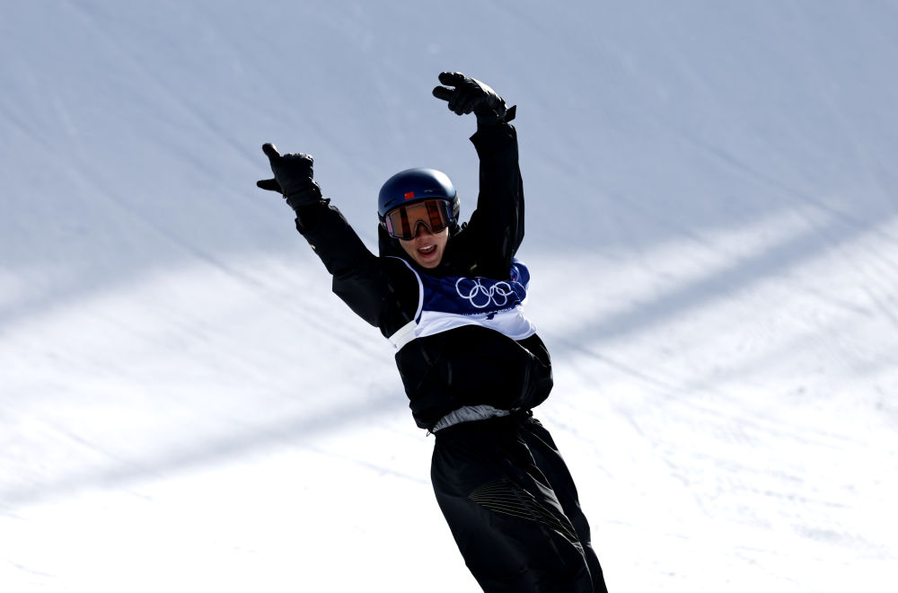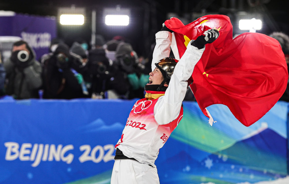 徐夢桃在張家口云頂滑雪公園舉行的北京2022年冬奧會自由式滑雪女子空中技巧決賽奪冠后慶祝(2022年2月14日攝)。新華社記者 吳壯 攝 |