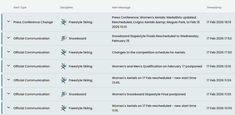圖為米蘭冬奧組委17日發(fā)布的多條賽事改期通知。 短道速滑項目18日進入倒數(shù)第二個比賽日,將產(chǎn)生男子500米和女子3000米接力項目的金牌。中國隊劉少昂和林孝埈已進入男子500米四分之一決賽,想爭取獎牌甚至金牌,還要經(jīng)過三輪比賽的考驗。 作為冬奧會該項目衛(wèi)冕冠軍,劉少昂本賽季世巡賽500米排名第四,具備沖擊獎牌的實力。林孝埈雖然在本屆冬奧會尚未進入個人項目決賽,但他的彎道超越和內(nèi)道空間利用能力極強,任何對手都無法忽視他的存在。